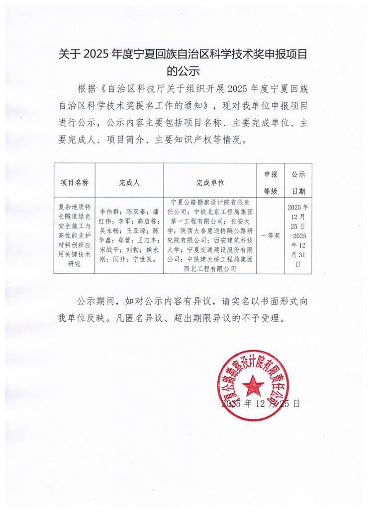 根据《自治区科技厅关于组织开展2025年度宁夏回族自治区科学技术奖提名工作的通知》,现对我单位申报项目进行公示,公示内容主要包括项目名称、主要完成单位、主......