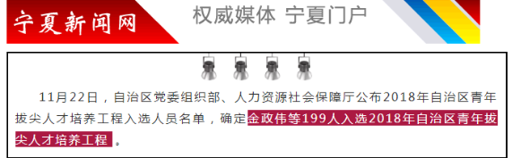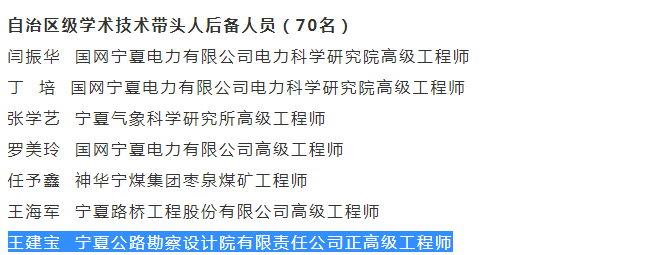11月22日,宁夏自治区党委组织部、自治区人力资源和社会保障厅联合公布了2018年自治区青年拔尖人才培养工程入选人员名单。此次交通系统共入选三人,其中宁夏公路勘察设计院有限责任公司王建宝入选自治区级学术带头人后备人员、张继周入选自治区优秀青年后备骨干人员。