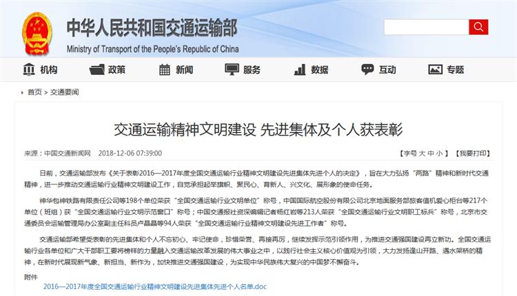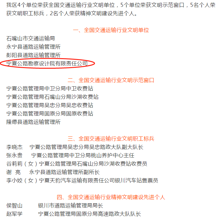 近日,交通运输部发布《关于表彰2016—2017年度全国交通运输行业精神文明建设先进集体先进个人的决定》(交政研发〔2018〕162号),对全国交通运输行业在思想道德建设和精神文明建设中成绩突出的先进集体和个人进行表彰。宁夏公路勘察设计院有限责任公司榜上有名,被授予“全国交通运输行业文明单位”称号。