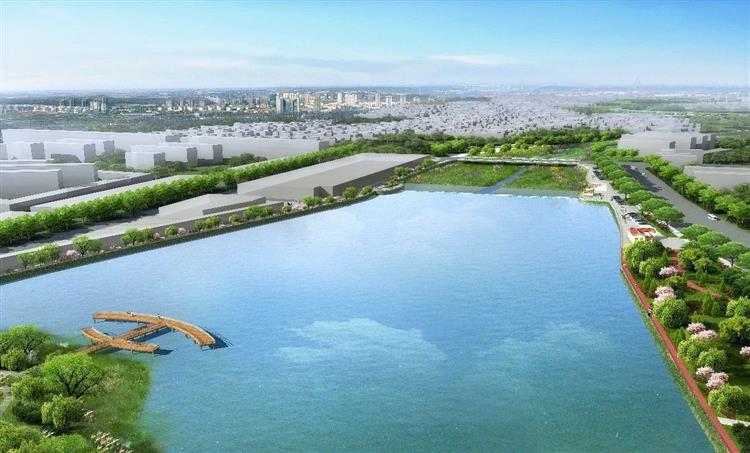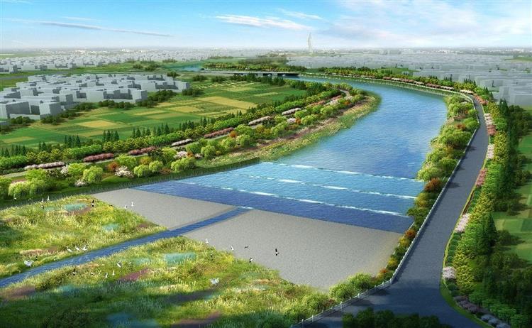 火车站桥上游基础河槽及景观绿化鸟瞰效果图