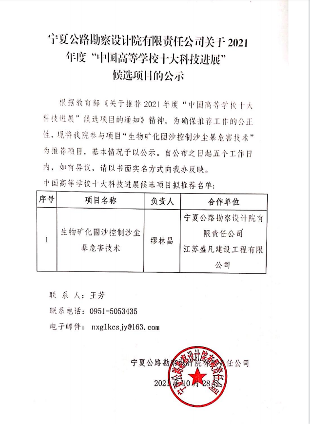 宁夏公路勘察设计院有限责任公司关于2021年度“中国高等学校十大科技进展”候选项目的公示