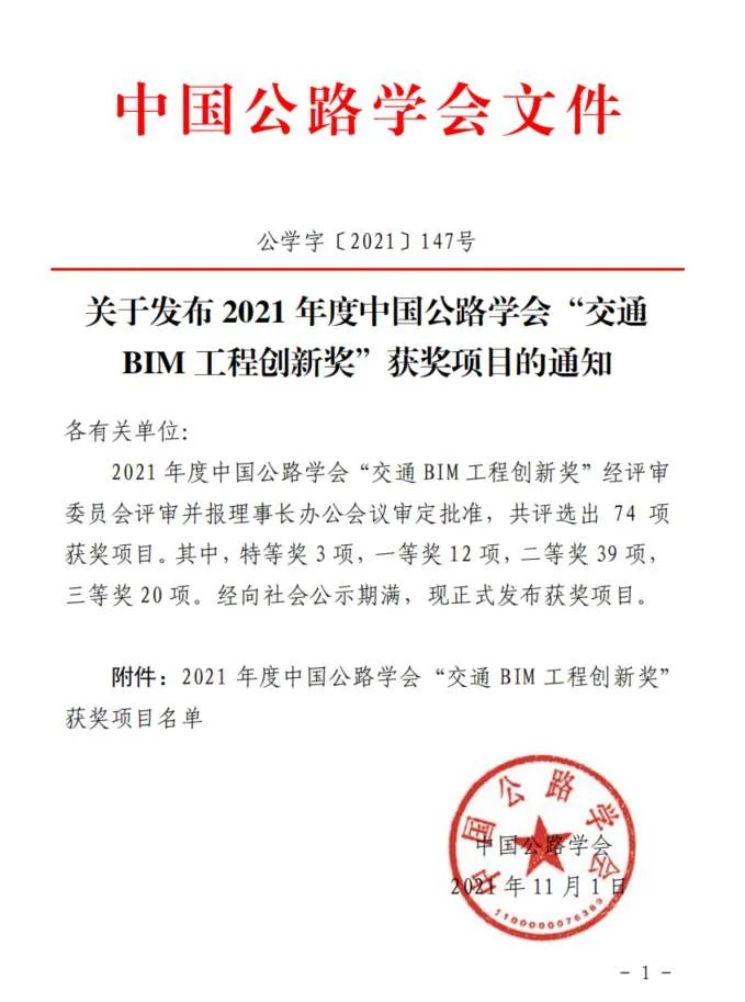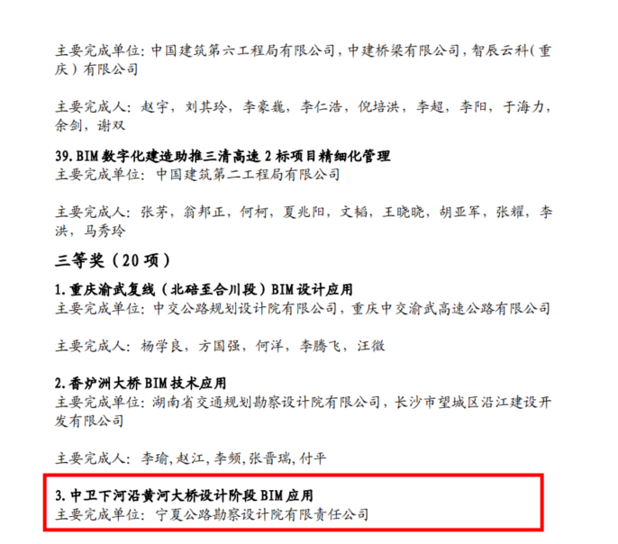 近日,2021年度中国公路学会“交通BIM工程创新奖”评审结果公布,由宁夏公路勘察设计院有限责任公司完成的《中卫下河沿黄河大桥设计阶段BIM应用》项目荣获中国公路学会“交通BIM工程创新奖”三等奖,同时这也是宁夏区内交通BIM技术应用获得的第一个全国奖项。