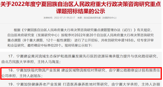 近日,宁夏公路勘察设计院有限责任公司成功中标《宁夏加快现代物流产业发展,建设区域物流枢纽对策研究》课题项目,该项目是自治区政府研究室2022年度宁夏回族自治区人民政府重大行政决策咨询研究重点课题之一,由自治区重大行政决策咨询论证专家,宁夏公路勘察设计院党委书记、总经理赵旭东主持。