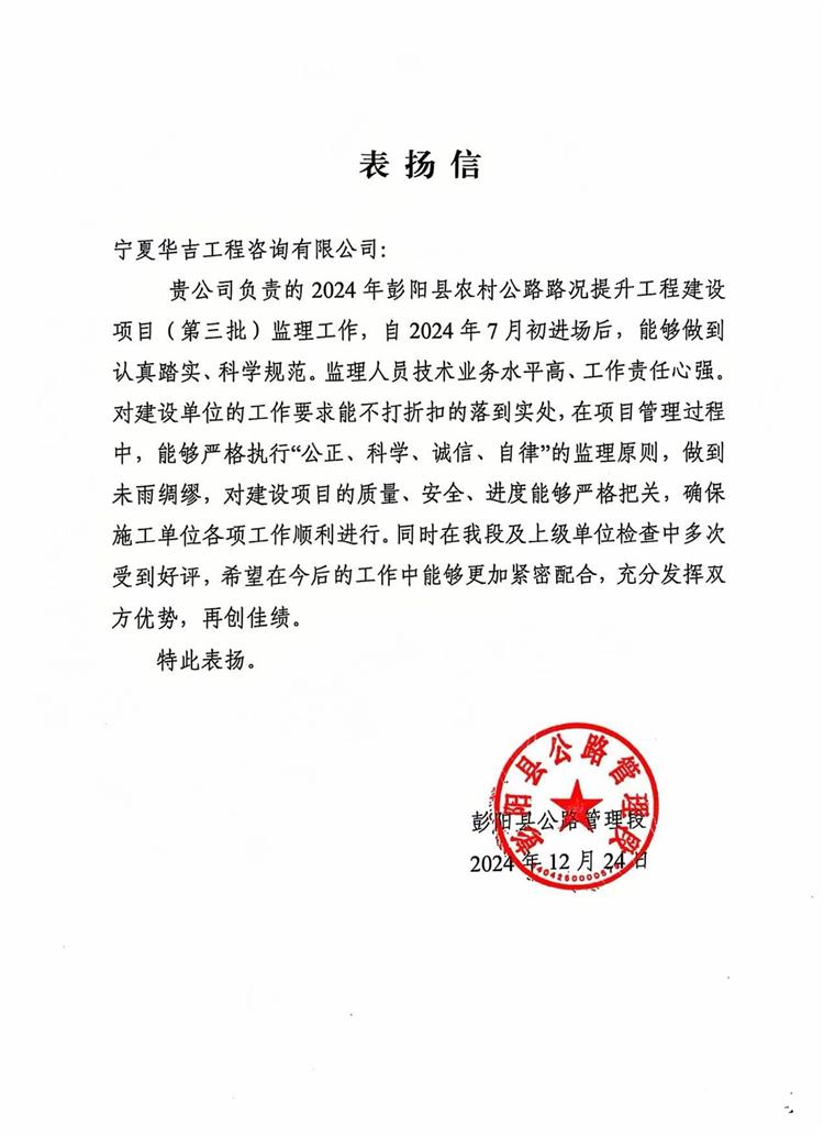 近日,宁夏华吉工程咨询有限公司(以下简称“华吉公司”)在彭阳县农村公路路况提升工程和G244线庆阳过境段(东绕城公路)项目监理工作中展现出卓越的专业能力和管理水平,受到了来自彭阳县有关交通部门和庆阳市交通运输局的高度赞誉。